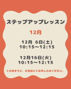 2025.11.17 卒業生 12月のステップアップレッスンの日程 12/6(土)10:15~12:15 12/16(火)10:15~12:15 お申し込みは、5日前までにお電話にてお申し込みください。 上野本校:03-5688-9344 この記事を書いた人 gakuin 前の記事